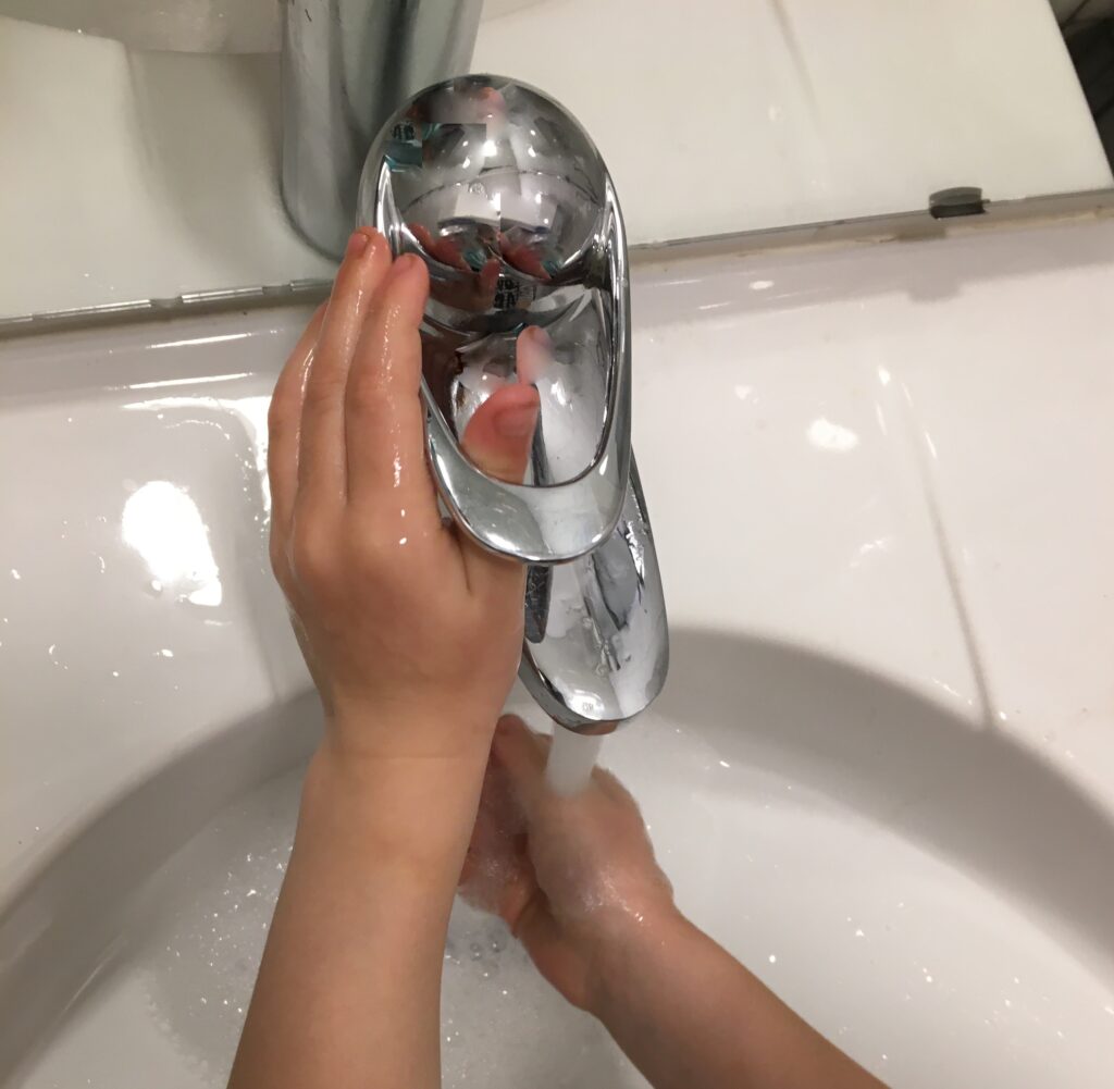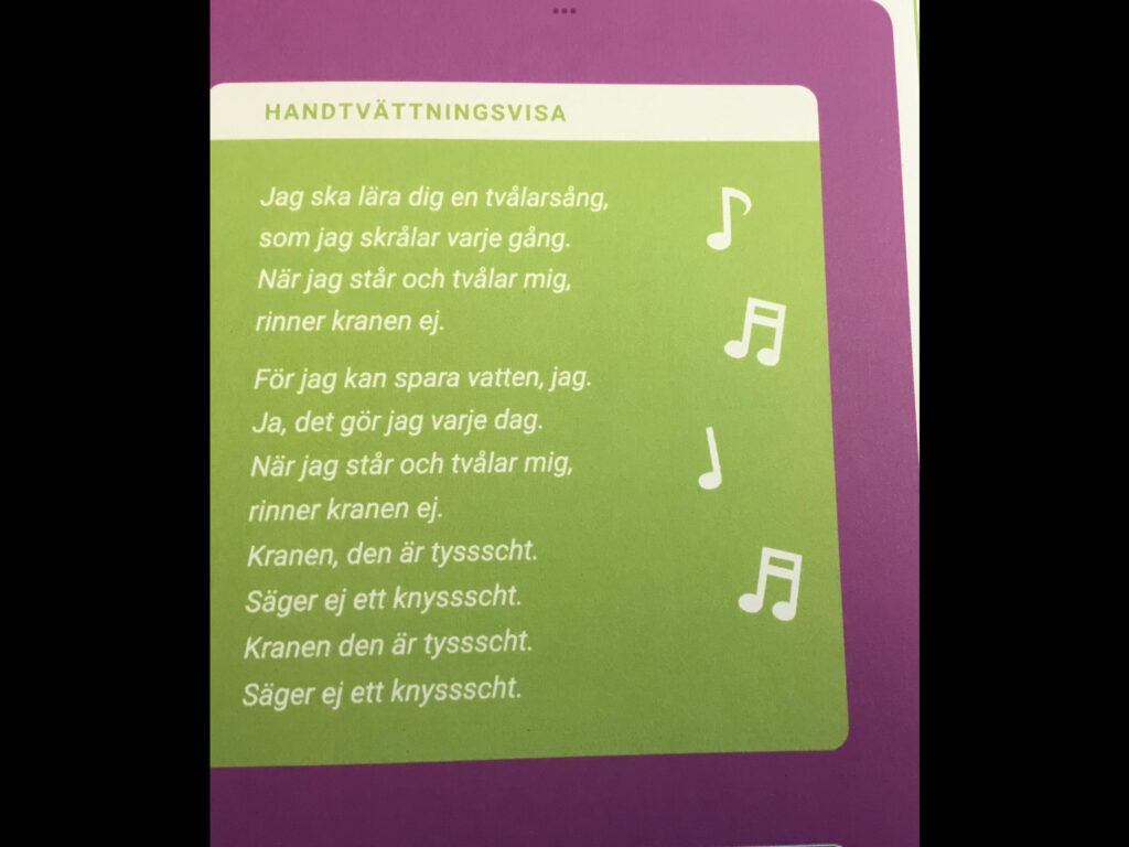 Vid handtvättning kan det råka slösas mycket vatten om man glömmer stänga av kranen under intvålningen. Här är en visa för att komma ihåg att spara på innevattnet. Träna tillsammans på texten och använd sen i vardagen.